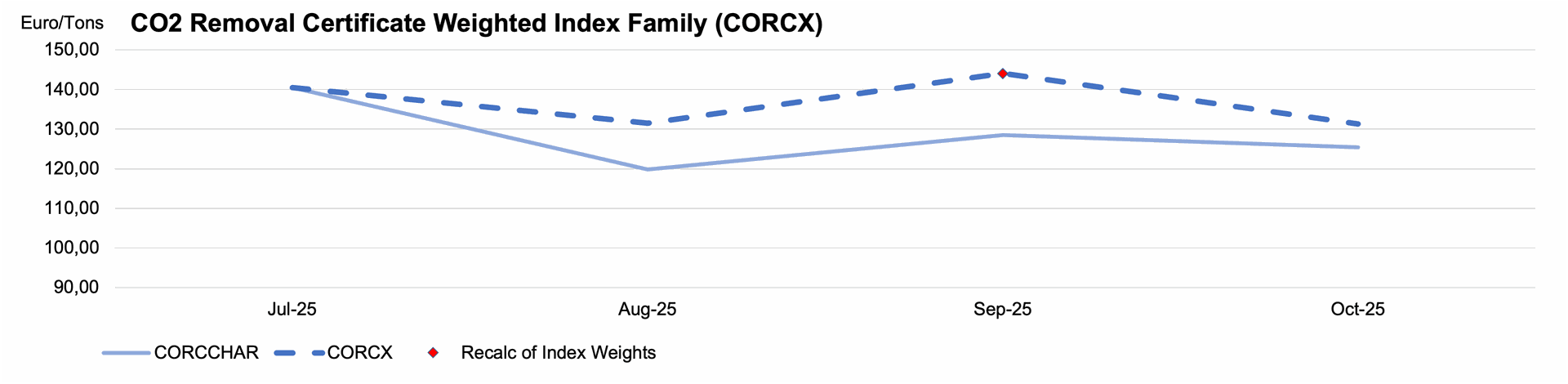 The CORC index family tracks the price of removing carbon from the atmosphere based on Puro Standard methodologies.