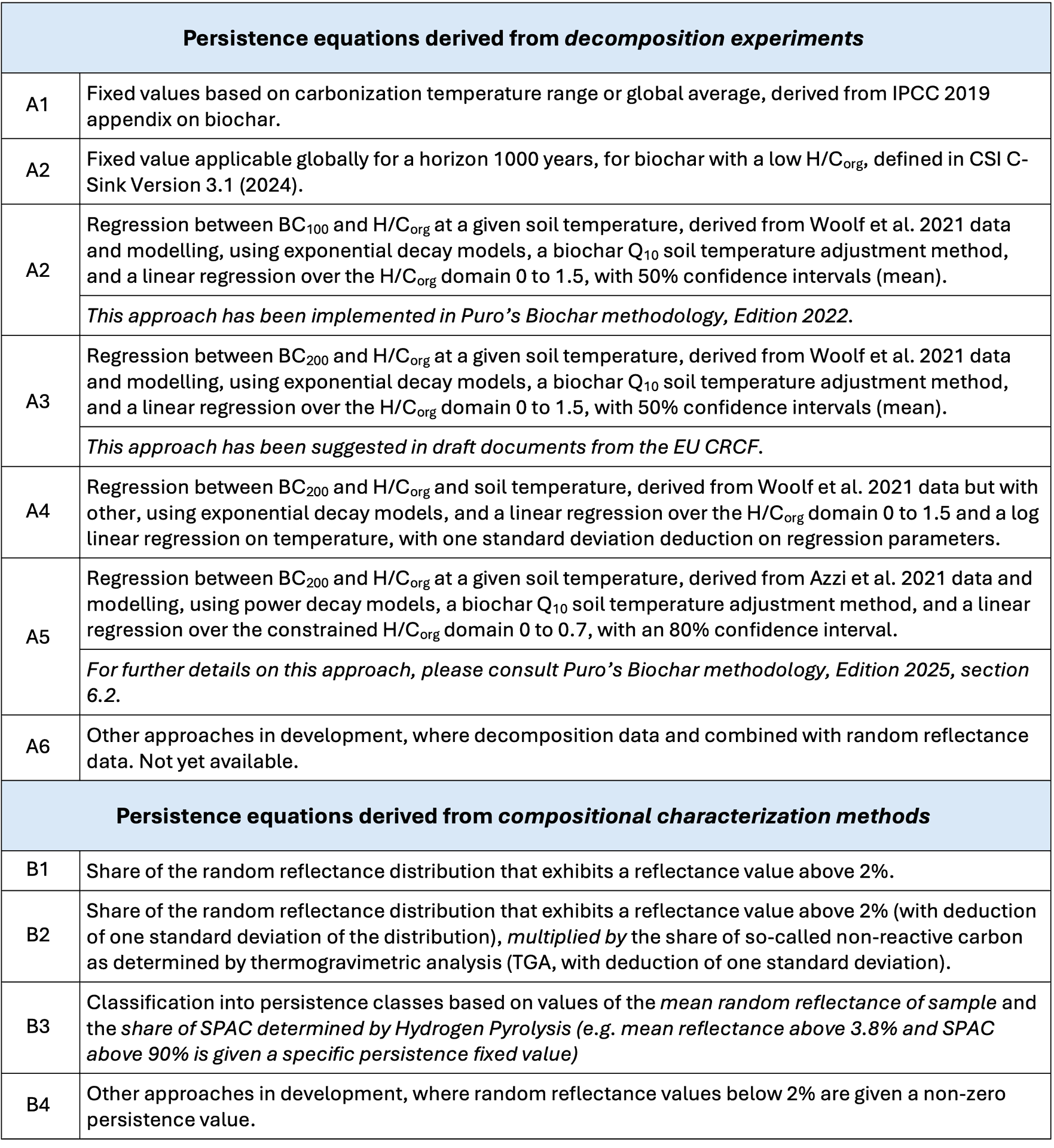 For equations based on compositional characterization methods (type B), change has been fast since their emergence: equations introduced less than two years ago are already being revised or replaced, sometimes producing substantially different results. However, limited theoretical justification and scarce public data make it difficult to assess these shifts and their implications for market integrity. This is exemplified by the recent evolution of random reflectance methods. Initially, the approach considered the fraction of the reflectance distribution exceeding 2% as representing permanent carbon storage. More recent proposals, however, suggest adjusting this fraction by multiplying it with the proportion of non-reactive carbon determined through thermogravimetric analysis (TGA), followed by the application of uncertainty deductions to each parameter. This change can in practice lead to markedly different persistence estimates, underscoring the sensitivity of results to methodological assumptions.